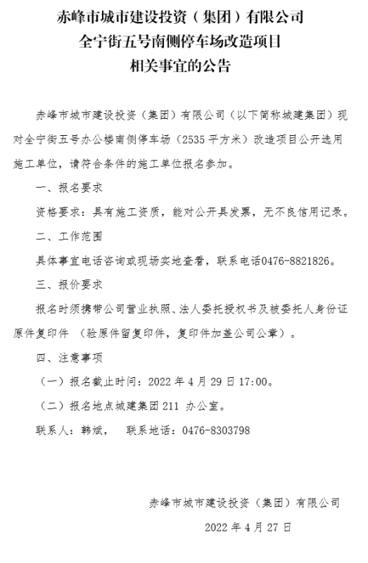 赤峰市城市建設(shè)投資(集團)有限公司 全寧街五號南側(cè)停車場改造項目 相關(guān)事宜的公告